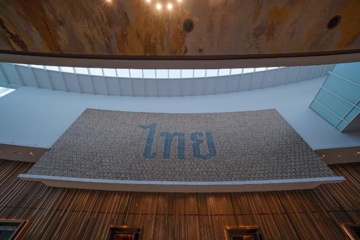 งานศิลป์สุดไอคอนนิกด้วยผลงานเทคนิคคอลลาจ (Collage) “รวมพลังความเป็นไทย” รังสรรค์โดยผู้ช่วยศาสตราจารย์ประทีป สุธาทองไทย ผู้มีชื่อเสียงด้านศิลปะภาพพิมพ์และ Photo Collage ระดับแถวหน้า โดยงานชิ้นดังกล่าว เปรียบเสมือนแลนดิ้งปิดท้ายทริปชมงานศิลป์อย่างสมบูรณ์แบบ ผ่านภาพที่รวบรวมทุกมิติของความเป็นไทยในแง่มุมต่างๆ ที่รวบรวมองค์ประกอบของไอคอนสยามที่แฝงเอกลักษณ์ของไทย พร้อมภาพจากผู้คนที่บอกเล่าถึงวัฒนธรรมที่ดีงามของประเทศในมิติต่างๆ กว่า 35,000 ภาพ มารวมหลอมไว้เป็นภาพขนาดใหญ่ยักษ์ 10 x 27 เมตร จารึกด้วยคำว่า ‘ไทย’ คำสั้นๆ แต่มีความหมายอันทรงพลังอยู่ตรงกลาง โดยใช้ฟ้อนต์ที่ให้ความรู้สึกถึงการบรรจบกันระหว่างความเก่าแก่และสมัยใหม่ พร้อมใช้แพตเทิร์นที่ได้แรงบันดาลใจจาก “ลายผ้าไทย” ด้วยดีไซน์ที่สื่อถึงความโมเดิร์นและไทยดั้งเดิม