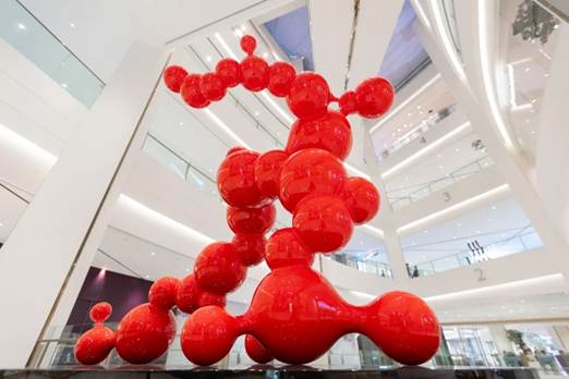 Red Bubble - by Donghoon Oh. A South Korean artist from Gyeongju, reimagines human forms as bubbles. Inspired by how soap bubbles that kids blow float briefly in the air before disappearing, the sculpture suggests how reality and illusion are separated by the thinnest of margins.