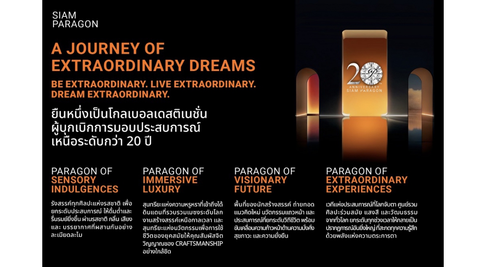 “Over the past two decades, Siam Paragon has evolved into one of the world’s most-visited global destinations, welcoming millions of visitors from every corner of the world. Today, as we step into a new era, we proudly unveil our Brand Essence Statement: Be Extraordinary • Live Extraordinary • Dream Extraordinary. Be Extraordinary calls on individuals to embrace their own exceptional uniqueness. Live Extraordinary invites everyone to experience life beyond expectations. Dream Extraordinary inspires people to imagine further and reach higher than ever before. Together, these expressions reaffirm Siam Paragon’s enduring commitment to Pioneering the Extraordinary — creating immersive, world-class experiences that continually elevate the way people live, connect, and dream.”