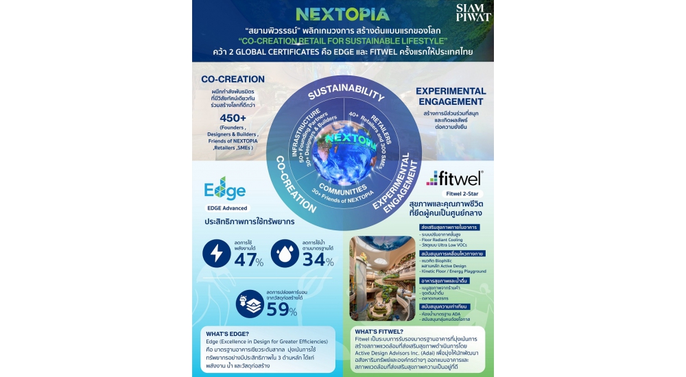 สยามพิวรรธน์นำ “NEXTOPIA” ณ สยามพารากอน พลิกโฉมวงการรีเทล สร้างต้นแบบแรกของโลก “Co-Creation Retail for Sustainable Lifestyle” คว้า 2 มาตรฐานสากล EDGE (Excellence in Design for Greater Efficiencies) ระดับ Advanced และ Fitwel ระดับสูง 2 ดาว ซึ่งถือเป็นครั้งแรกของประเทศไทย ที่ได้รับรองทั้งอาคารเขียวและการออกแบบเพื่อสุขภาวะและคุณภาพชีวิตที่ดีของผู้คน นอกจากนี้ NEXTOPIA เป็นพื้นที่ต้นแบบแรกที่ใช้พลังงานสะอาด 100% ตั้งแต่ปี 2026 และจะขยายครอบคลุมศูนย์การค้าทั้งหมดภายในปี 2030 พร้อมเดินหน้าสู่เป้าหมายการลดการปล่อยก๊าซเรือนกระจกสุทธิเป็นศูนย์ (Net Zero) ในขอบเขตที่ 1 และ 2 ภายในปี 2050