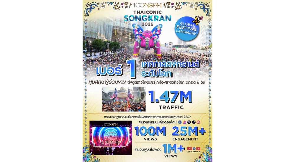 คุณสุพจน์ ชัยวัฒน์ศิริกุล กรรมการผู้จัดการ บริษัท ไอคอนสยาม จำกัด เปิดเผยว่า ไอคอนสยามและพันธมิตรภาครัฐและเอกชน มีความภาคภูมิใจเป็นอย่างยิ่งที่ร่วมกันจัดงานเทศกาลสงกรานต์ประจำปี 2569 ภายใต้ชื่อ “ICONSIAM THAICONIC SONGKRAN 2026” ถือเป็นส่วนสำคัญในการอนุรักษ์ และเผยแพร่เทศกาลสงกรานต์ไทยอันเป็นมรดกโลกทางวัฒนธรรม ให้ทุกคนได้มีส่วนร่วมและสัมผัสประสบการณ์อันทรงคุณค่านี้ร่วมกัน การจัดงานในปีนี้ ประสบความสำเร็จเกินความคาดหมายอย่างมาก กิจกรรมทั้งหมดได้รับความสนใจ มียอดทราฟฟิกหมุนเวียนตลอดเทศกาลทั้ง 6 วัน รวมกว่า 1.47 ล้านคน โดยจำนวนผู้ร่วมงานเติบโตทั้งในกลุ่มชาวไทยและนักท่องเที่ยวต่างชาติ นอกจากนั้น ยังสร้างปรากฎการณ์บนโลกออนไลน์ มีผู้ชมคอนเทนต์ตลอดเทศกาลสงกรานต์สูงมากถึง 100,000,000ครั้ง (views) ตอกย้ำให้ประเทศไทยและไอคอนสยามเป็นแลนมาร์กงานเทศกาลระดับโลกอย่างแท้จริง
